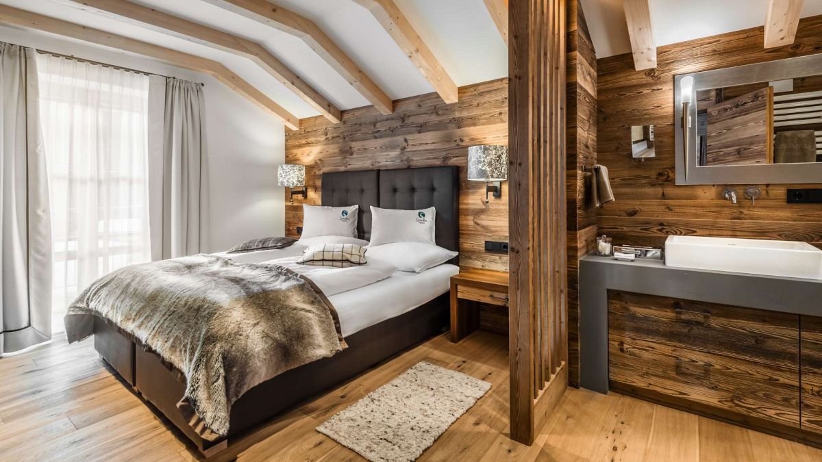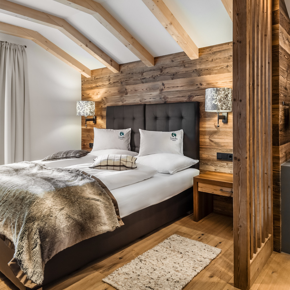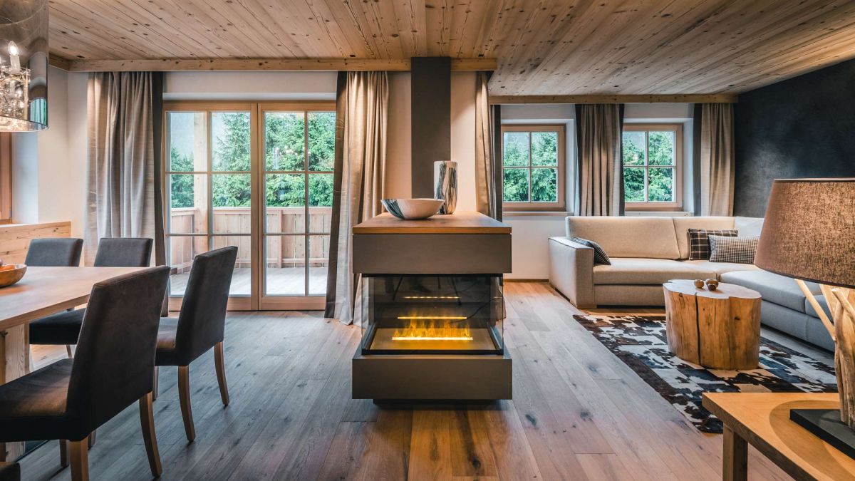 Camere arredate in uno stile alpino moderno e confortevole, un accogliente soggiorno open space e una cucina perfettamente attrezzata.